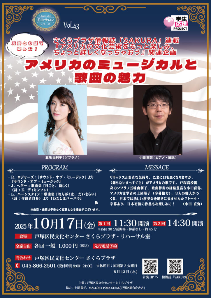 MUSISMの五味由利子が今月17日(金)、戸塚区民センターさくらプラザにて、「アメリカのミュージカルと歌曲の魅力」と題された演奏会に出演いたします。
